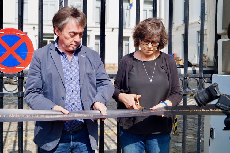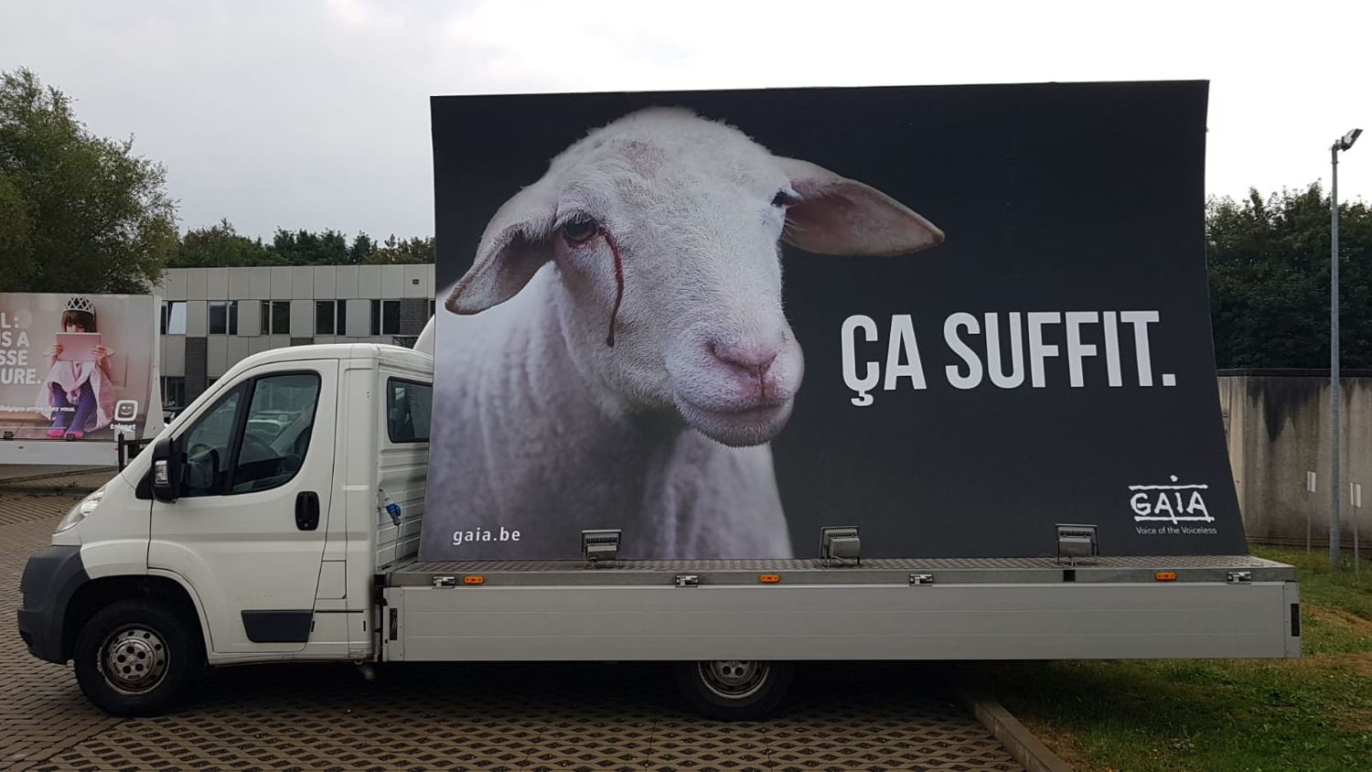 Brussel, 21 augustus 2018 - Deze ochtend voerde dierenrechtenorganisatie GAIA aan het Huis van het gewest actie voor een wettelijk verbod op onverdoofd slachten in het Brussels Hoofdstedelijk Gewest. In een ceremoniële sfeer – blazerskwintet en naambordjes incluis – doopten GAIA-voorzitter Michel Vandenbosch en GAIA-directeur Ann De Greef op de tonen van The Imperial March uit Star Wars en vanop een zwarte loper de zetel van de Brusselse regering om tot ‘Huis van onverdoofd slachten’. Meteen ook de start van een nieuwe campagne: tot en met 25 augustus staat een ‘affichemuur’ van 20 m² beurtelings in Anderlecht, Ukkel en Evere opgesteld met de afbeelding van een schaap met een droevige blik. Uit een van zijn ogen dwarrelt een bloedtraan. Met Hoe lang nog? Ca suffit als opschrift is de boodschap duidelijk: “De Brusselse regering moet het voorbeeld van Vlaanderen en Wallonië volgen en om het even waar in het hoofdstedelijk gewest nog voor het einde van deze legislatuur een einde maken aan het onverdoofd slachten van schapen en runderen”, legt GAIA-voorzitter Michel Vandenbosch uit. “Dat betekent dus ook in het slachthuis van Anderlecht, waar vandaag voor het offerfeest honderden schapen en runderen onverdoofd en bijgevolg pijnlijk worden geslacht. Bijna 8 op 10 Brusselaars staan achter onze eis.” Her en der in Brussel rijden de hele week ook affichewagens onder andere langs enkele Brusselse partijhoofdkwartieren rond.