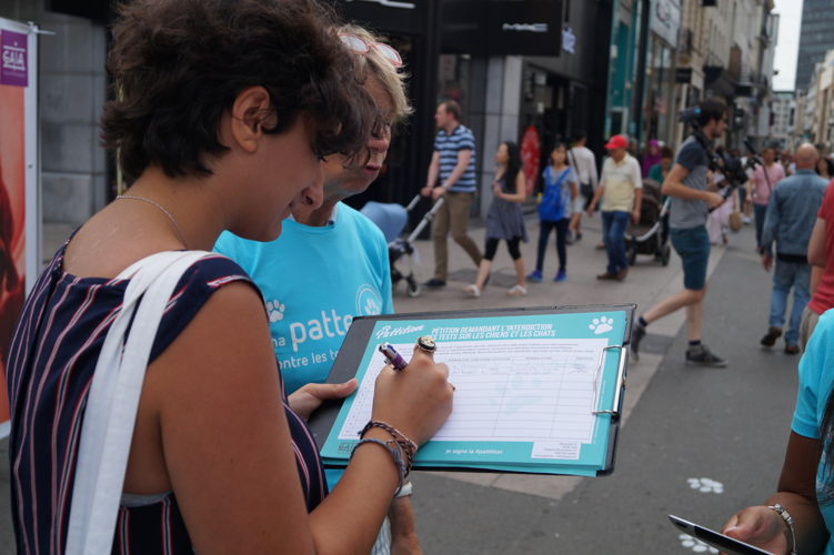 Medewerkers en vrijwilligers van GAIA nodigden voorbijgangers én hun viervoetige vrienden aan om hun hand- of poottekening te zetten onder de Pootitie, de allereerste petitie in zijn soort, die niet alleen door de ‘baasjes’, maar ook door hun viervoetige levensgezellen kan getekend worden. Honden waren dan ook van harte welkom op de GAIA-stand in de Brusselse Nieuwstraat, waar ze getrakteerd werden op een kleine versnapering.