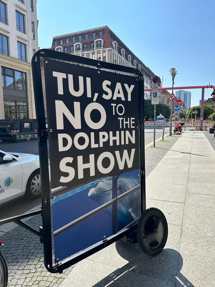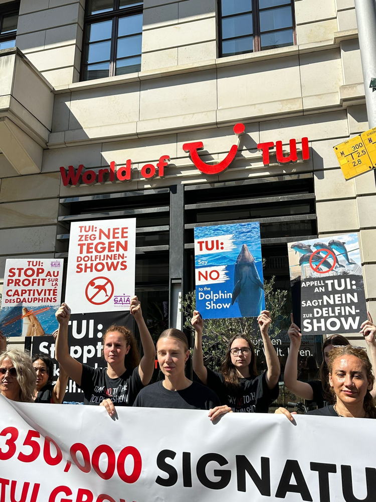 Un collectif rassemblant les plus grandes associations de protection animale dont World Animal Protection, PETA, One Voice et GAIA, s'est réuni aujourd’hui devant le siège de TUI Group à Berlin pour appeler le géant du voyage à mettre fin à la vente et à la promotion d’activités exploitant des dauphins en captivité. Une banderole géante affichant les 350 000 signatures recueillies dans le cadre d’une pétition lancée par les associations a été dévoilée lors de la manifestation. Le collectif a également mené des actions coordonnées sur les réseaux sociaux afin de faire pression sur le tour-opérateur.