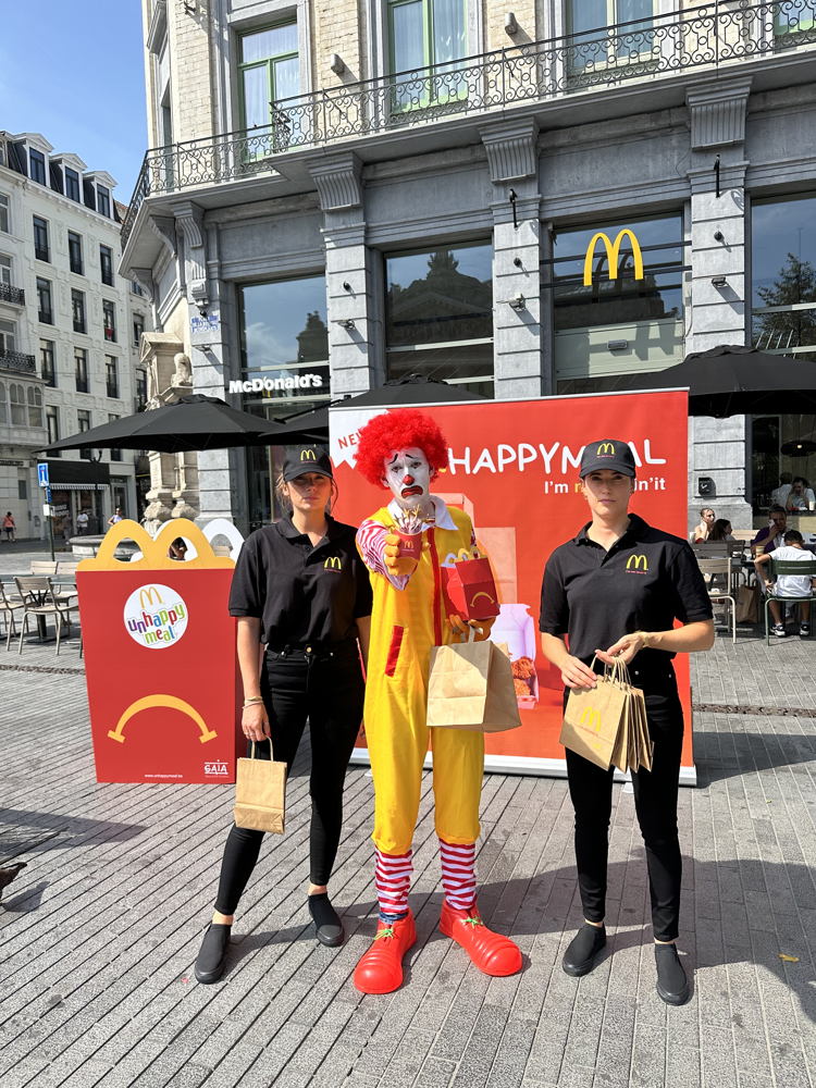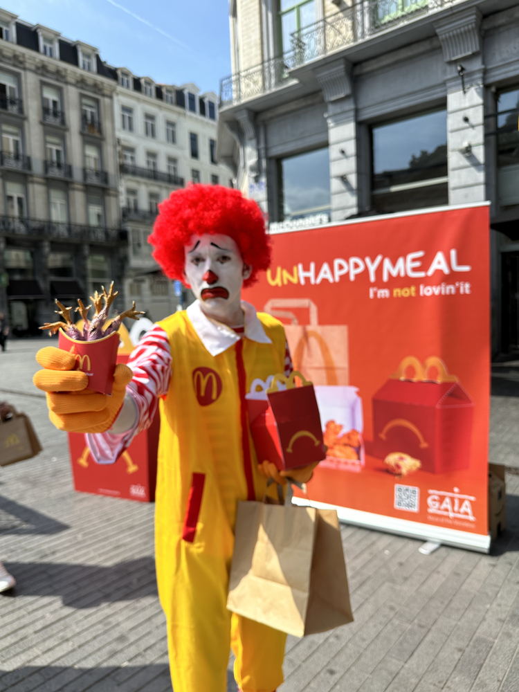 Bruxelles, le 29 août 2024 - GAIA a dévoilé ce jeudi son « Unhappy Meal », une version malheureuse du célèbre menu pour enfants. Avec cette nouvelle campagne, l’association vise à dénoncer les conditions de vie des poulets qui approvisionnent les restaurants McDonald’s. GAIA appelle le géant du fast-food à agir et à prendre des mesures.